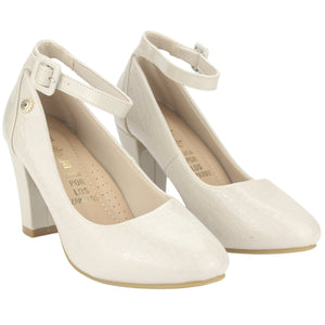 Zapato Mujer Casual Cobna-6 Color Beige de Capellada Sintetico con Forro Textil y Planta de Goma, su Taco mide 8 cm aprox y su Tipo de Cierre es Hebilla