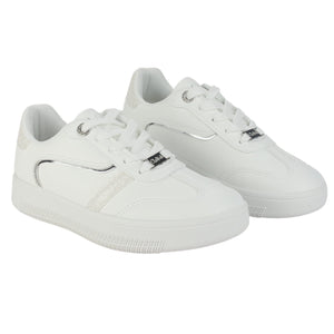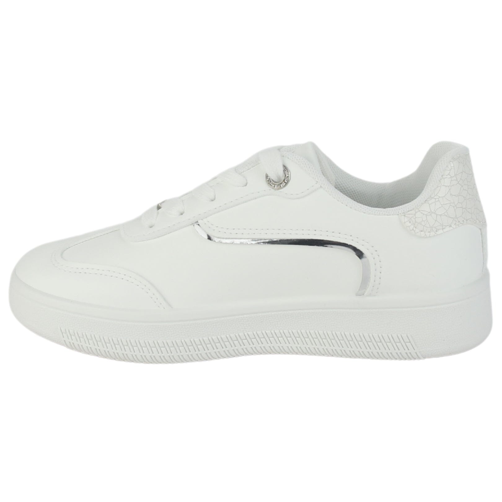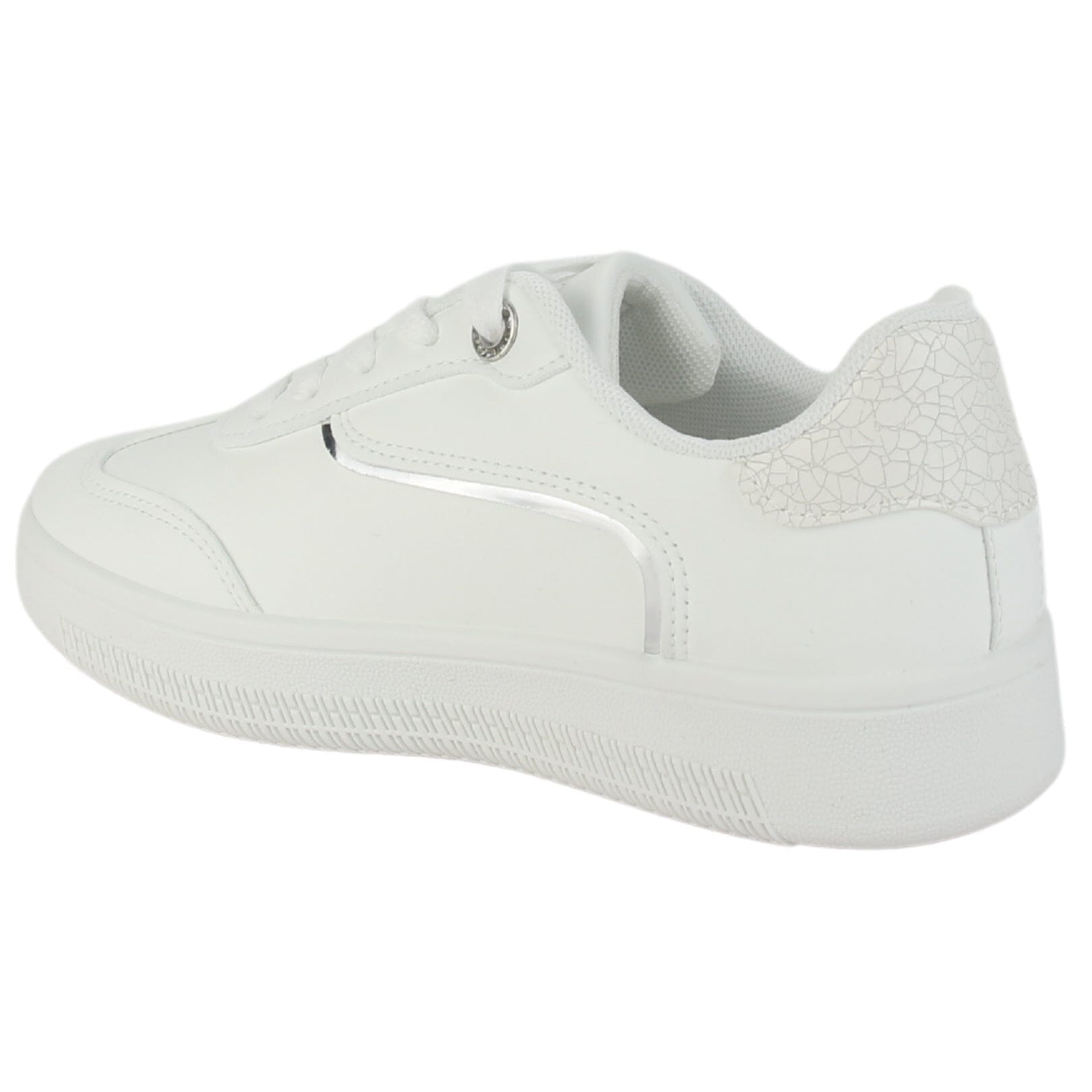 Zapatilla Chalada Mujer Kela-1 Blanco Urbano de Capellada Sintetico con forro Sintetico y planta de Goma y su Plataforma mide 3 cm aprox, la altura de su caña es estándar, el contorno de su bota es estándar