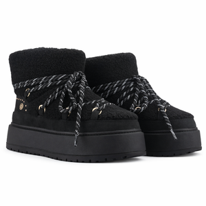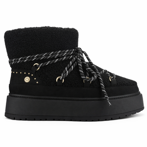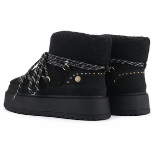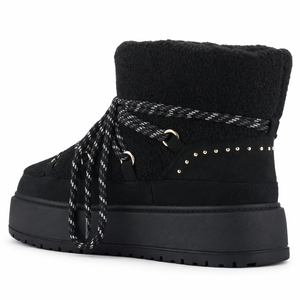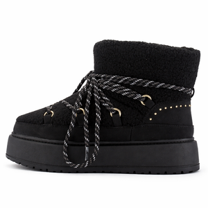 El Botín Negro Mujer Ailen es ideal si buscas un botín mujer abrigador con estilo bota de nieve. Su exterior de textil chiporro, cordones redondos ajustables y suela de goma con plataforma y tachas decorativas entregan comodidad, estabilidad y un look moderno para acompañar tus outfits de invierno.