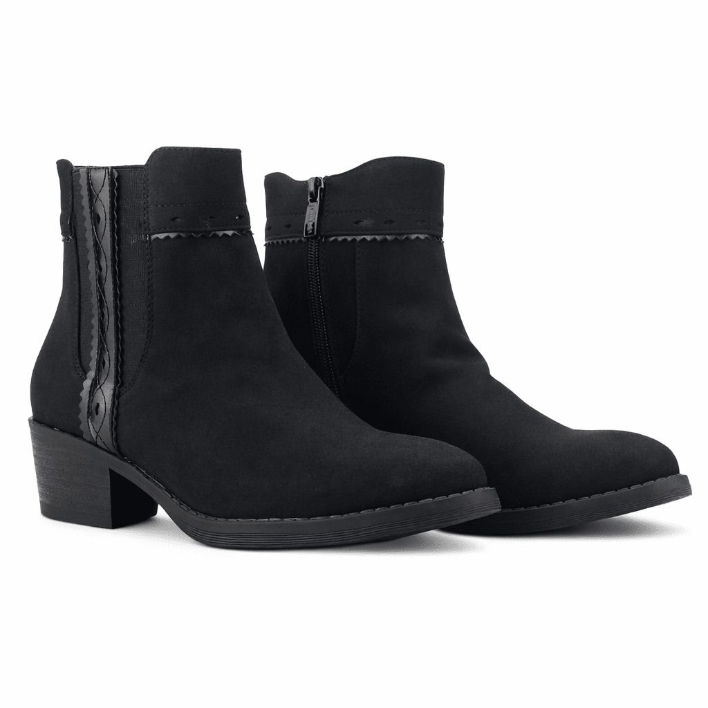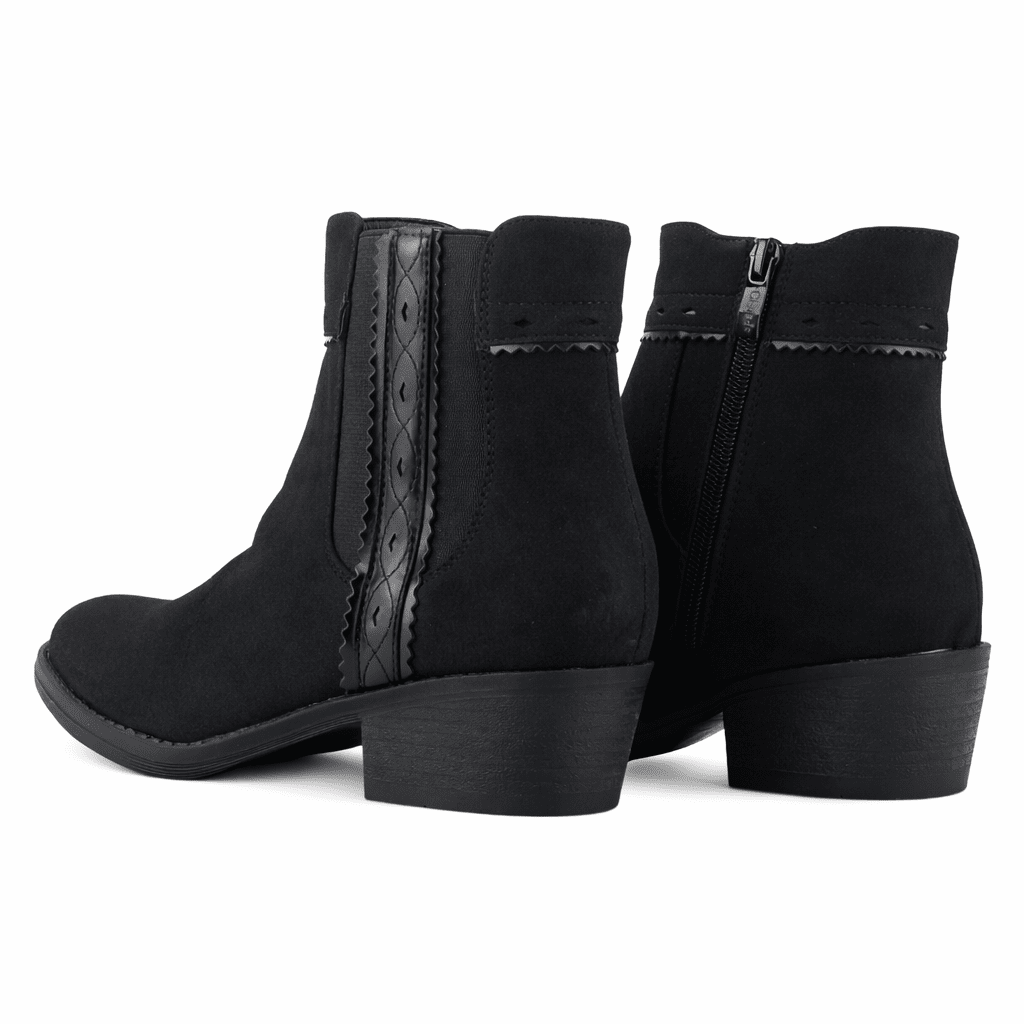 Bota negra mujer casual Chalada Camp, una bota urbana con inspiración western diseñada para destacar con estilo en la temporada de otoño e invierno. Su capellada sintética con efecto gamuza en color negro ofrece un look versátil y fácil de combinar. Incorpora bordados geométricos que refuerzan su estética folk, junto a un corte tipo Chelsea que facilita el calce. Su taco cubano con efecto madera aporta altura, estabilidad y un estilo auténtico.