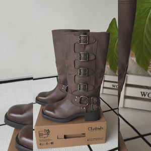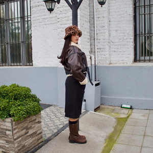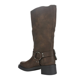 Bota Mujer Casual Biker-2 Color Café de Capellada Sintetico con Forro Textil y Planta de Goma, su Taco mide 5 cm aprox, su Plataforma No Aplica, su Caña 32 cm aprox, Contorno de pantorrilla 38 cm aprox y su Tipo de Cierre es Elasticado