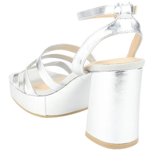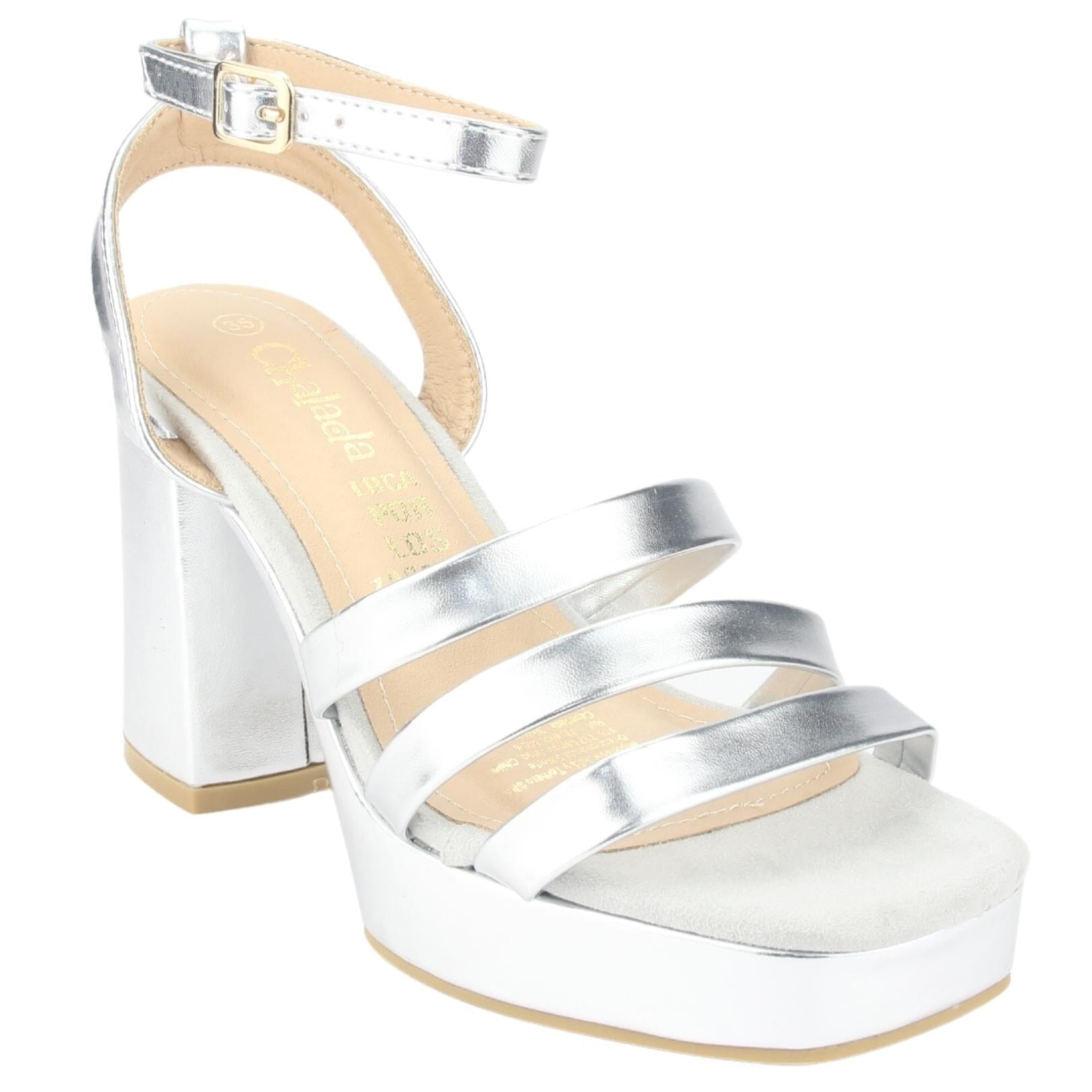 Sandalia Mujer Casual Sussi-3 Color Plateado de Capellada Sintetico con Forro Sintetico y Planta de Goma, su Taco mide 10 cm aprox, su Plataforma 3 cm aprox y su Tipo de Cierre es Hebilla