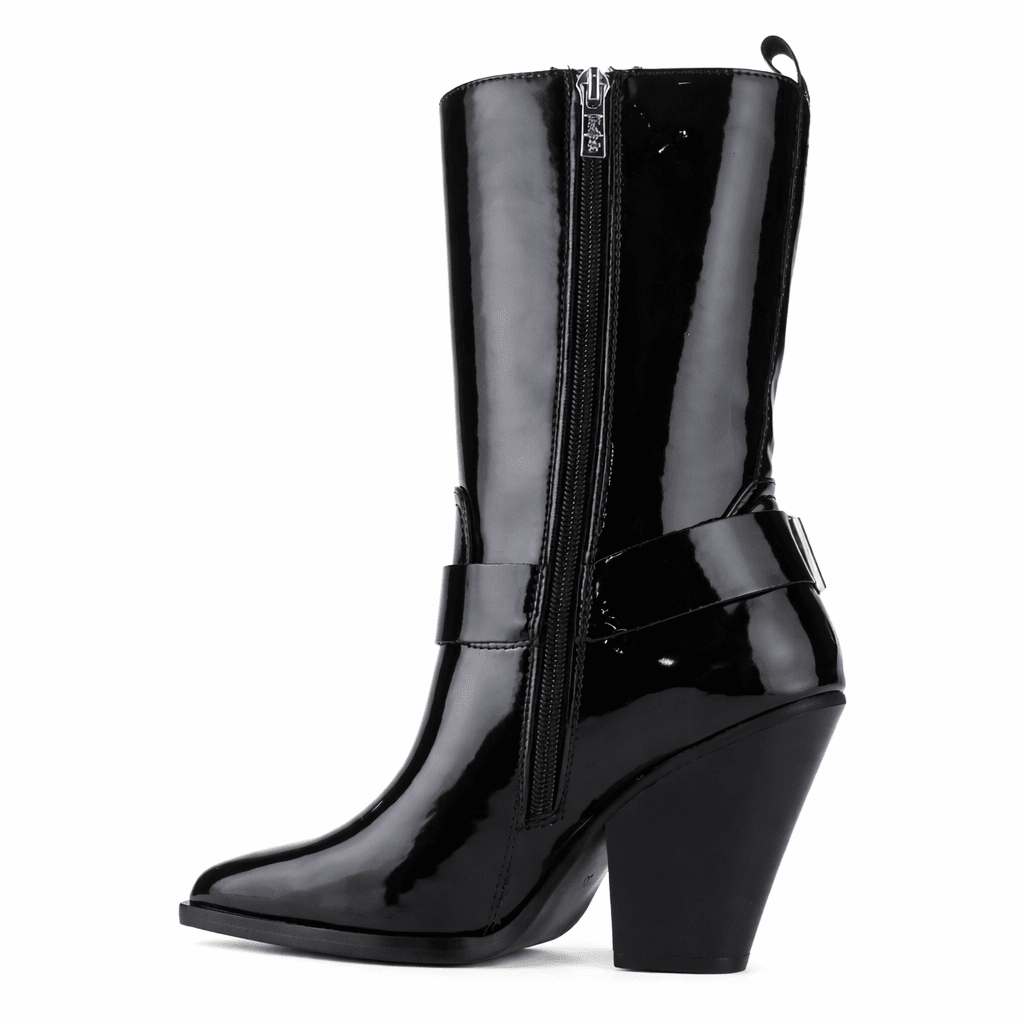 Botín Negro Mujer Arizona, un diseño de estilo biker con toque vaquero que aporta carácter y personalidad a cualquier outfit. Este botín negro de mujer combina actitud urbana con detalles inspirados en el western, destacando sus hebillas decorativas que refuerzan su estética audaz y moderna. Su taco de 10 cm estiliza la figura, mientras que su caña de 22 cm entrega mayor estructura y presencia en cada paso.
