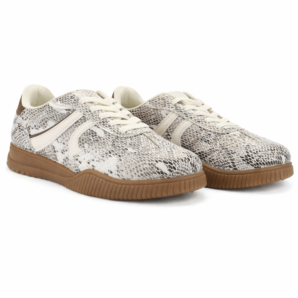 Zapatilla Blanco Mujer Orion, una zapatilla casual de estilo urbano y perfil bajo que combina inspiración retro con detalles modernos. Su diseño dinámico y su capellada con estampado tipo snake en tonos neutros aportan un look llamativo y sofisticado, ideal para complementar outfits cotidianos con personalidad.