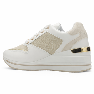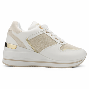 Sneaker Blanca Mujer Bolkinew, un modelo urbano que combina estilo, altura y comodidad. Su capellada blanca con detalles en color beige y dorado aporta un look moderno y versátil, mientras la plataforma en cuña de 7 cm realza tu figura y mantiene confort en cada paso.
