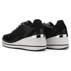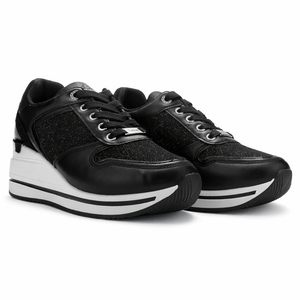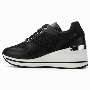 Sneaker Negra Mujer Bolkinew, un modelo urbano que combina estilo, altura y comodidad. Su capellada de eco cuero con detalles en plata aporta un look moderno y versátil, mientras la plataforma en cuña de 7 cm realza tu figura y mantiene confort en cada paso.